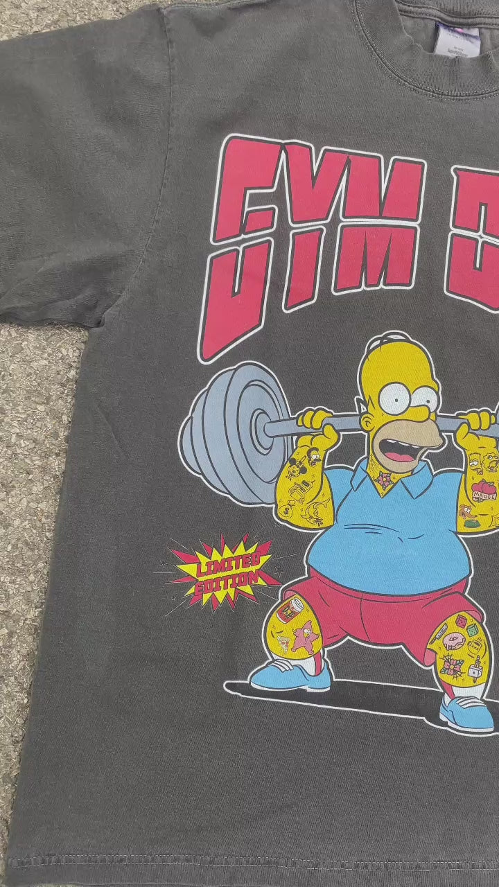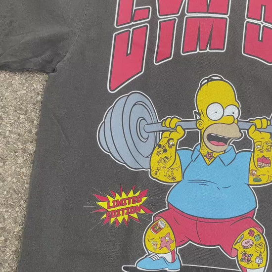 This heavyweight Shaka Wear tee features a hand-drawn Homer Simpson, boldly inked and jacked, lifting beer-barbell weights like a true legend. Bright reds, blues, and yellows stand out on the black shirt, while his tattooed beer mug sleeves add a funny twist to gym culture. A perfect blend of streetwear style and animated chaos for those who love a playful edge.
