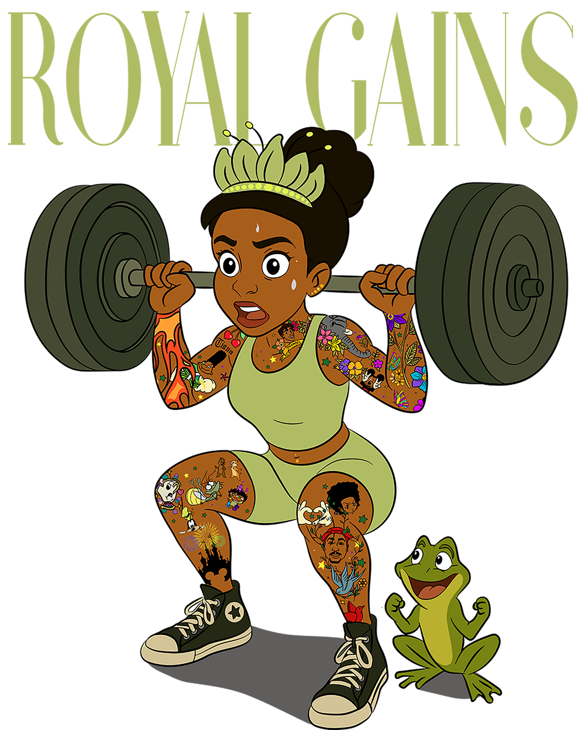Elevate your workout game with the Princess Tiana Gym Tee—a playful tribute to strength and hustle. This tee showcases a bold tattooed Princess Tiana mid-squat with a barbell, inspiring confidence every time you wear it. Made from 100% cotton Shaka Wear fabric, it offers a premium heavyweight feel with an oversized streetwear fit. Featuring a vibrant full-back print and pre-shrunk durability, it’s perfect for gym sessions or just flexing your royal attitude all day long. Real royalty earns their gains, and this tee lets everyone know it.